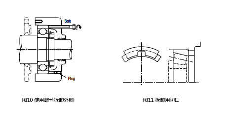 拆卸過盈配合的外圈,如圖10所示。事先在軸承座的圓周上設置幾處螺紋孔,用于安裝、拆卸用螺栓。通過均勻地擰緊螺栓來拆卸軸承。這些螺紋孔平常蓋上盲塞。圓錐滾子軸承等分離型軸承,如圖11,在軸承座擋肩上設置幾處切口,使用墊塊,用壓力機拆卸,或輕輕敲打拆卸。